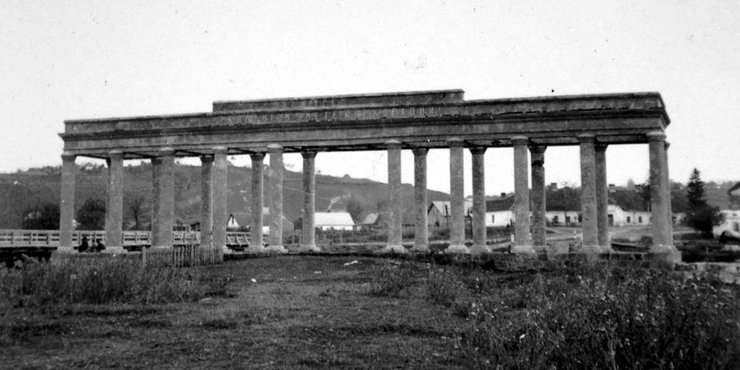Изначально верхнюю часть колоннады украшала аббревиатура "УССР" и миролюбивый лозунг-предупреждение: "Комунізм змете усі кордони!". Последнее активно начали реализовывать 17 сентября 1939 г., когда через Збруч потянулись колонны советских танков.