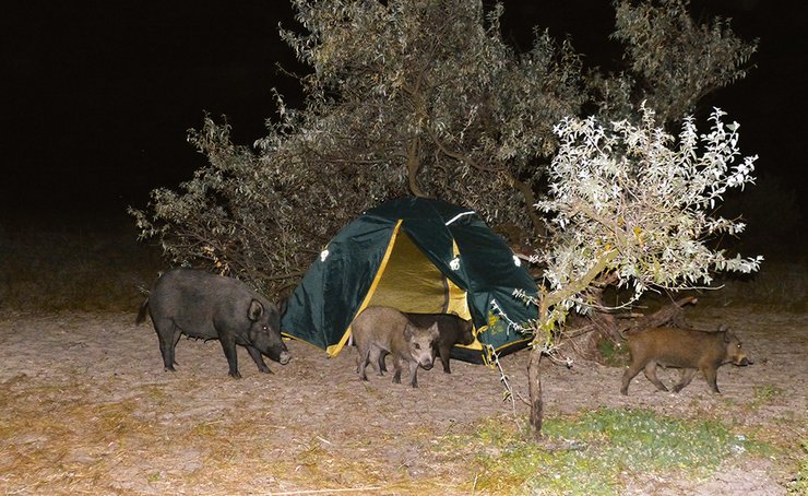 Через какое-то время, уже в темноте, "жена" того самого кабана с поросятами пришла к палатке, чтобы убедительно попросить еды. Они тут совсем ручные! Достаточно ничего им не давать и немного пошуметь, чтобы процессия отправилась к следующим палаткам. Во вторую ночь, кроме свиней, вокруг палатки рыскала енотовидная собака.