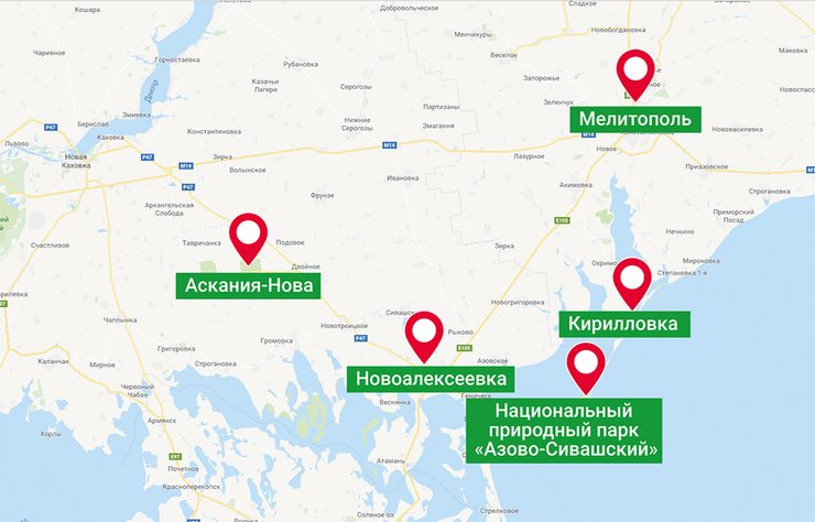 Самый удобный вариант — ориентироваться на Мелитополь, крупный город в Запорожской области. В направлении Бирючего острова от Мелитополя ехать в сторону курортного поселка Кирилловка по Е105 и М18. В Асканию-Нова из Мелитополя по Е58/М14 в направлении Новой Каховки, после Петропавловки взять направление на Новотроицкое и Новоалексеевку по Р47, доехав до Чкалова, свернуть к заповеднику.