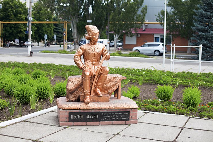 Впрочем, официальный памятник в городе тоже есть. Навестить позолоченно-бетонного Махно на лавочке с саблей в руках можно в самом центре — на пересечении улиц Петровского и Шевченко.