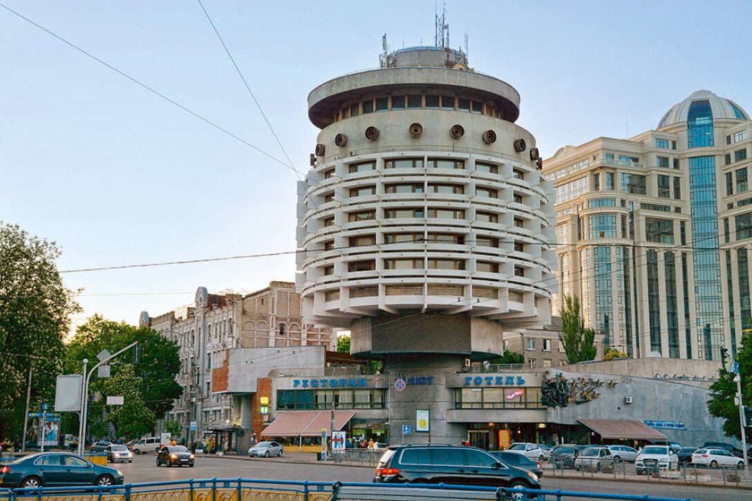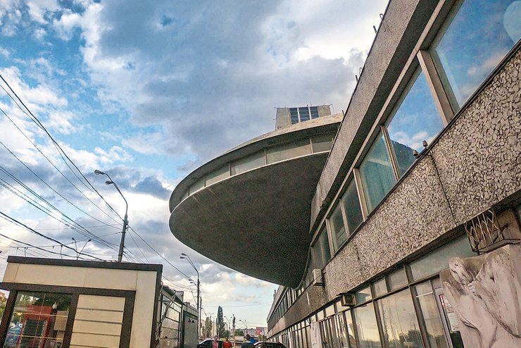С площади Славы перемещаемся на Лыбедскую: на этой площади находится "летающая тарелка" — самый известный киевский памятник советского модернизма. За рубежом "тарелку" знают очень хорошо, ведь именно к ней первым делом приходят иностранные любители современной архитектуры. Свое название здание получило из-за кинозала, спроектированного в форме НЛО, которое будто приземляется на горизонтальную платформу-стилобат. Из этой цокольной платформы "вырастает" еще одно здание — прямоугольная высотка, которая тянется ввысь и таким образом уравновешивает горизонтальные части строения.