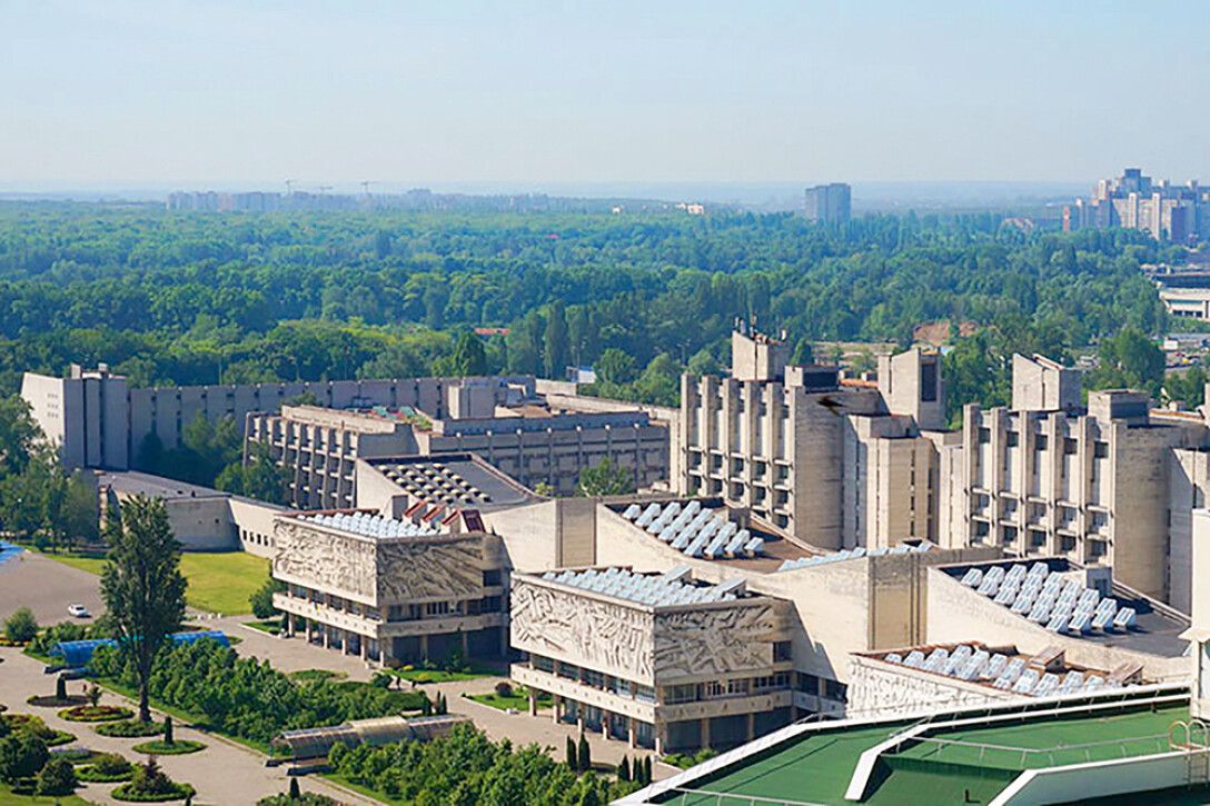 Финальной точкой модернистского маршрута по Киеву является ВДНХ. В 1970-е напротив выставки был пустырь на окраине города. Чтобы его оживить, городские власти решили построить на этом месте новые корпуса Киевского национального университета имени Тараса Шевченко и студенческий городок. Этот проект часто называют "кубинским", но это не так — его создавали киевские архитекторы, в том числе Михаил Будиловский, один из самых ярких представителей профессии той поры. Будиловский создал футуристический комплекс, который должен был включать десяток корпусов различных факультетов, ректорат — высотку со шпилем, обширную инфраструктуру и даже подземный туннель, который бы соединял университет с ВДНХ. К сожалению, построена лишь малая часть проекта — четыре корпуса факультетов физики, радиофизики, мехмата и кибернетики. Эти белые здания и сейчас выглядят эффектно. Здание физического факультета, фасад которого выходит на проспект, над главным входом имеет ступенчатый "трамплин", а над каждым окном — "ребра" для защиты от солнца, которые задают ритм всему комплексу.