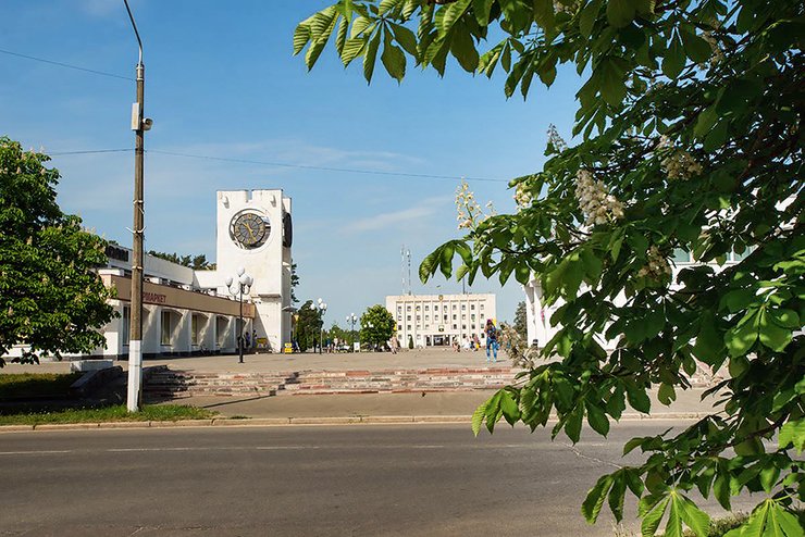 В геометрическом центре города находится главная площадь, где сконцентрированы важнейшие общественные учреждения. За универсамом "Днепр" с часовой башней проглядывают многоэтажки "маленького Тбилиси", а сразу за киноконцертным комплексом виднеются желтые дома Таллинского квартала. Белорусского квартала в атомграде нет, зато есть белокаменный универмаг "Минск" с рядом колонн, к строительству которого приложили руку наши северные соседи.