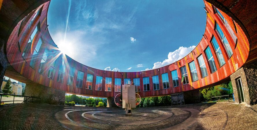 На насыпном холме в центре города пять огромных серых пилонов держат на себе бетонное кольцо, покрытое миллионами кубиков красной смальты. Камень, металл, смальта, серый и красный цвета очень удачно передают дух эпохи кровавого гражданского и национального противостояния начала ХХ века. Именно так выглядит Хмельницкий областной литературно-мемориальный музей Николая Островского. Он находится в Шепетовке — небольшом, но знаменитом в советское время городке, славу которому принес роман Островского "Как закалялась сталь".