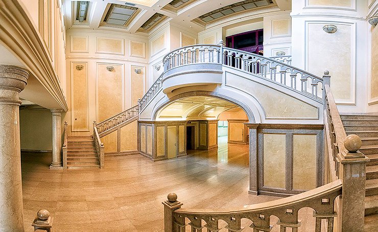 Заглянем внутрь, тем более что это не запрещено. На первых двух этажах Центра расположилась галерея, соединяющая все семь башен здания. Она выполнена в стиле старинного Екатеринослава: стенные пролеты в виде 12 фасадов знаменитых днепропетровских еврейских зданий — мужские и женские училища, синагоги, пункты обмена шекелей, мацепекарни и другие места, где проходила еврейская жизнь города. Уникальный декор из мрамора и иерусалимского камня — символичное продолжение Стены плача. Он специально изготовлен для Центра, после чего производство отдельной линии было разобрано, а значит, такой камень повторить уже невозможно.