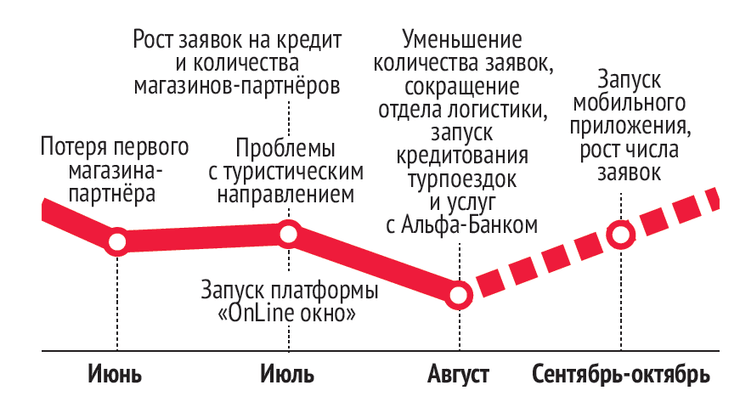 Август для RocketCredit стал хоть и непростым, но все же продуктивным. Компания запустила онлайн-кредитование турпоездок и услуг через Альфа-Банк. "Пока проект работает в пилотном режиме. Ждем первую одобренную банком заявку для тестирования процессов. Готовили проект три месяца, но все-таки запустили", — не скрывает гордости Алексей Сироткин. Еще одно достижение — разработка совместно с "Мост Экспресс" предложения для банков по доставке покупателю кредитного договора вместе с товаром. Проект получил название "Кредит на диване".