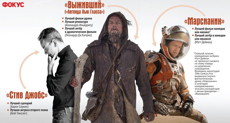 Кинематографическую премию "Золотой глобус", ежегодно вручаемую Голливудской ассоциацией иностранной прессы, действительно принято считать репетицией "Оскара". Если традиция прошлых лет продолжится, главным триумфатором этого года станет Леонардо ди Каприо: драме "Выживший" ("Легенда Хью Гласса"), в которой актер исполнил главную роль, досталось сразу три "Золотых глобуса".