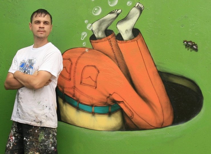 Первую работу, которую можно считать муралом, мы с Алексеем Бордусовым сделали в Ялте летом 2004 года. Хотя шли к этому с конца 1990-х, начав с традиционных граффити, постепенно совершенствуя технику и стиль и переходя к композициями без шрифтовых элементов.