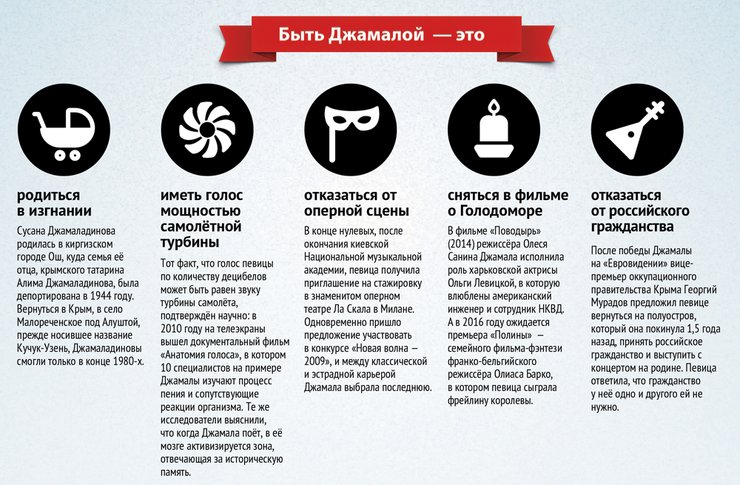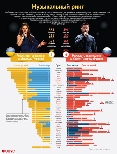 Проигрыш представителя России Сергея Лазарева Джамале вызвал бурю негодования в РФ. Там считают, что Джамала выиграла незаслуженно, в том числе потому, что ее песня имеет политический подтекст. Российские политики призывают бойкотировать конкурс, упражняясь при этом в остроумии: "Мне кажется, было бы неплохой идеей спеть песню о президенте Сирии — Асаде [на "Евровидении-2017"]", — предлагает Мария Захарова, официальный представитель МИДа РФ. Чиновник даже сочинила текст: "Кровавый Асад, Асад хуже всех, дайте мне приз, чтобы конкурс прошел у нас". А 15 мая на международной платформе change.org появилась петиция с призывом пересмотреть результаты "Евровидения-2016": обращение за двое суток собрало 300 тыс. подписей. Впрочем, организатор конкурса — Европейский вещательный союз уже выступил с официальным заявлением: "Украина есть и останется победителем "Евровидения" 2016 года". А российская истерия вокруг победы Джамалы, по сути, сыграла против самой России — ведь теперь для многих в Европе стали очевидными исторические параллели между преследованием крымских татар после российской аннексии Крыма и депортацией крымскотатарского народа в 1944 году.