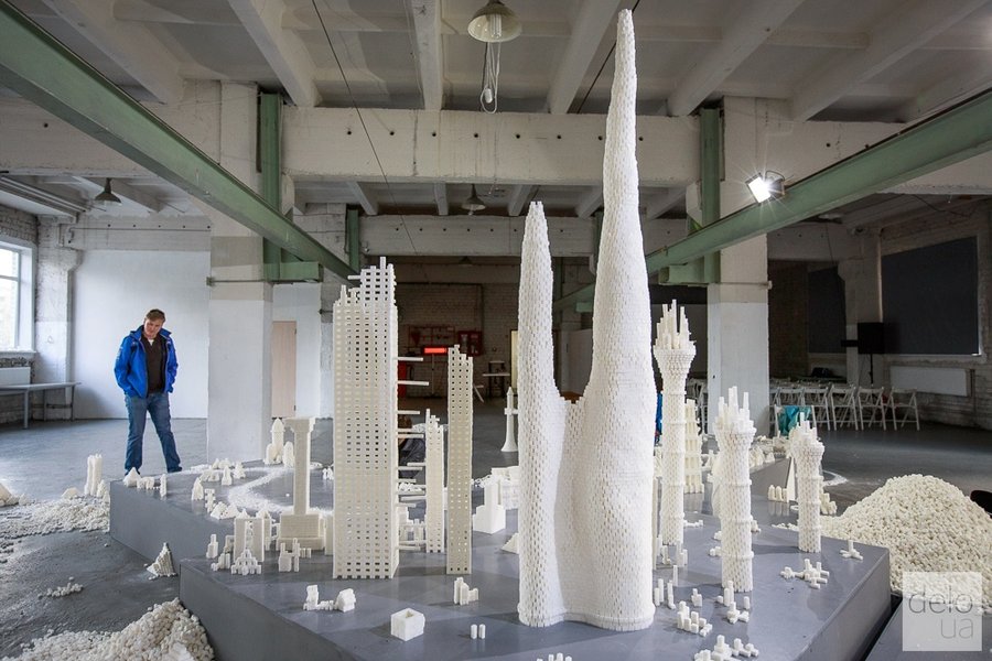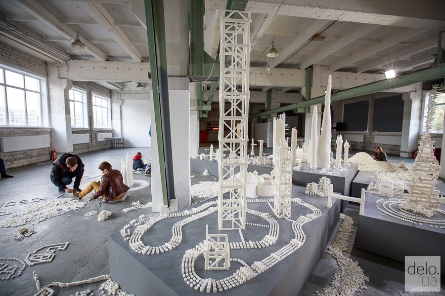 "На выставке представлены архитектурные сооружения из кубиков сахара. В центре сахарной инсталляции размещена модель киевского Дома учителя. Вокруг него художники создали супрематические архитектоны Казимира Малевича", - говорится в публикации.
