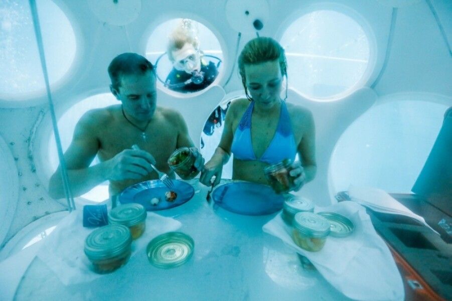 Блюда доставляют официанты в водолазных костюмах. При этом всю еду тщательно упаковывают в банки и помещают в специальный кейс.