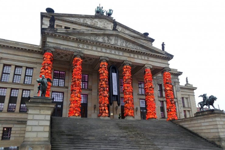 Колонны одного из главных концертных залов Германии китайский художник Ай Вэйвэй превратил в инсталляцию. Она посвящена кризису эмигрантов. Около 14 тысяч спасательных оранжевых жилетов — это напоминание о том, как много таких же жилетов остается на греческом побережье, когда на него высаживаются мигранты с Ближнего Востока. Именно оттуда, с острова Лесбос, Ай Вэйвэй привез все материалы.
