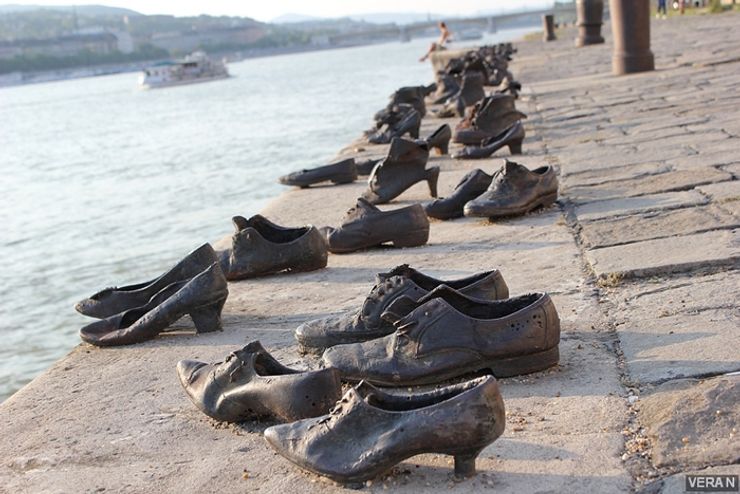 Вдоль набережной стоят 60 пар бронзовой обуви. Именно в этом месте в 1944-1945 годах нацисты казнили евреев. Их приковывали друг к другу, подводили к краю набережной и стреляли в первого в цепи. Тот падал в воду и влек за собой остальных. На смерть люди шли без обуви — ее заставляли снять, ведь в это время башмаки и туфли стоили дорого. И их можно было без проблем продать на черном рынке. Тем более обувь была самая разная: детские босоножки, женские туфли, мужские ботинки.
