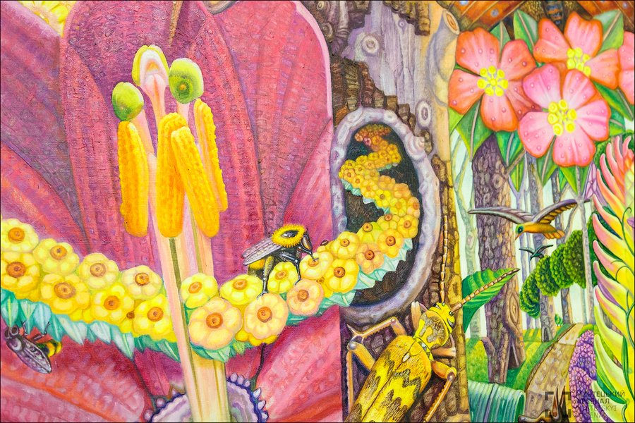 Такое мироощущение не сымитируешь. Зато обыграть его в художественном плане, использовать как контекст можно — одним из направлений выставки в "Арсенале" является как раз перекличка в творчестве между художниками, что называется, "самодеятельными", и профессиональными. Такой перекличке, выраженной в расположенных рядом картинах разных художников и эпох, посвящено несколько экспозиций. Например, в зале, отведенном под картины Марии Примаченко, выставлено еще и монументальное полотно Арсена Савадова "Страна Шу", написанное в его фирменном реалистично-сюрреалистическом стиле. На табличке — пояснения самого Савадова: "Мария Примаченко — звезда наивного искусства. А может быть, другого (искусства. — Фокус) и нет. На самом деле у Примаченко много страшных образов. Если убрать всю матиссовскую декоративность, то ее образы очень сильные и не очень-то добрые. Что пробуждало прекрасное — этот страх или декоративность — для меня осталось тайной. Но если увеличить много ее образов одновременно, то, скорее всего, это будет не менее страшно, чем "Парк Юрского периода" Спилберга. Когда я писал картину "Страна Шу", то взял маленькие цветы Примаченко, сделал их громадными, как в поп-арте, и посадил туда своих моделей. Я увеличил их как современный художник, но такое впечатление, что это ее мир. Это и есть диалог между художниками, между культурами".