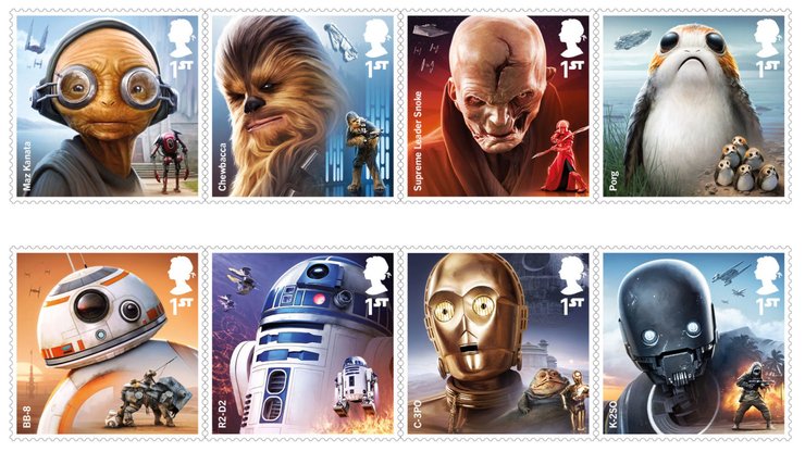 Набор состоит из восьми марок. На них изображены как новые, так и старые персонажи космической саги, в том числе – Чубакка, C-3PO и BB-8.