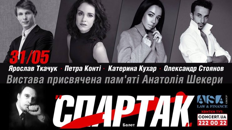 31 мая в Национальной опере Украины – балет "Спартак", где впервые главные партии исполнят мировые звезды балета прима-балерина миланского La Scala и Boston ballet Петра Конти и знаменитый дуэт жгучих брюнетов Национальной оперы Украины Екатерина Кухар и Александр Стоянов.