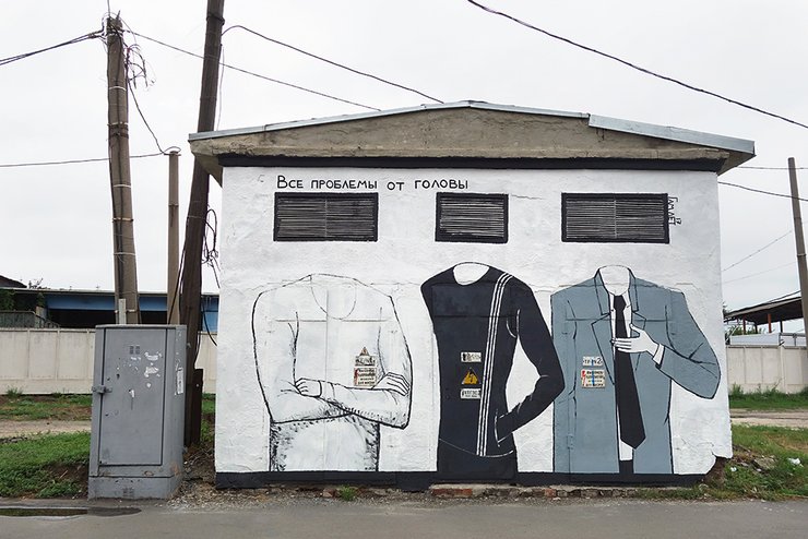 — Какая разница, кто что думает. У меня есть свои задачи. В какой-то момент я решил, что, зная весь центр, сделаю лабиринт. У меня целый маршрут построен — как пройти так, чтобы увидеть все работы. Идеальный маршрут для трех человек и двух бутылок вина. Это классная штука — создание своего лабиринта в сетке города. Это была моя задача. Я ходил по улицам и думал: так, в этом квартале мне нужно что-то сделать для продолжения моей схемы. Плюс это создает дополнительное наполнение города как такового. Можно, конечно, обойтись и без стрит-арта, но он создает дополнительную радость, дополнительный интерес, даже если картинки нерадостные, как мои.