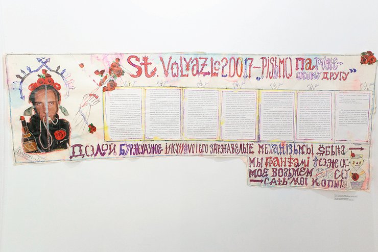 — Экспозиция начинается не со входа, а из глубины музейного коридора: ее отправная точка — стенгазета "Письмо парижскому другу", о которой я упоминала. На том же самом месте она висела во время 5-й Одесской биеннале современного искусства в прошлом году. В следующем зале — пять мониторов с видео, которое было очень важным инструментом для художника. Как оппозицию к этим его зрелым произведениям мы сделали зал с ранними работами в стиле "пенис-арт". Еще один зал включает развороты из днепропетровского журнала "НАШ", флагмана альтернативной культуры 1990-х, где Волязловский неоднократно публиковал фото своих работ и тексты.