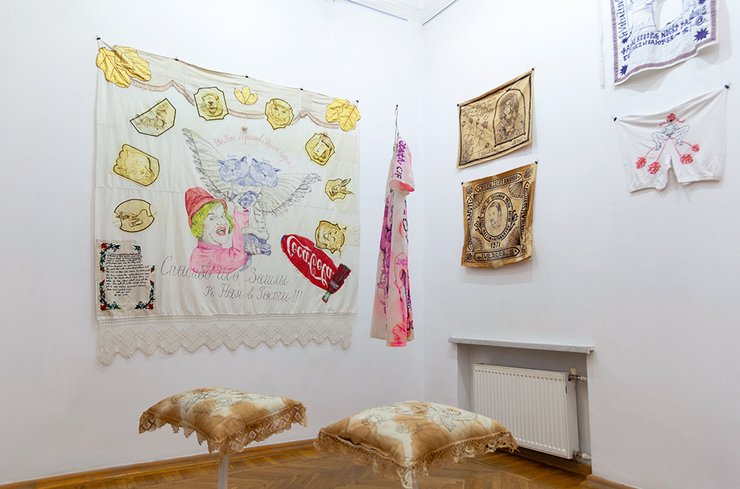 Одна из центральных точек выставки — зал с "тряпками" (текстильными работами. — Фокус), которые давно стали визитной карточкой художника. Следующий зал — это графика и текстовые работы, раскрывающие перед зрителем истории, которые можно читать бесконечно. Финал экспозиции мы задумали безмолвным: напечатали стихотворный сборник Волязловского, чтобы люди могли забрать частичку выставки с собой.