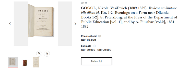 Первое издание легендарного произведения украинского писателя Николая Гоголя "Вечера на хуторе близ Диканьки" продали на аукционе Christie's в Лондоне за $217 тысяч (175 тысяч фунтов стерлингов).