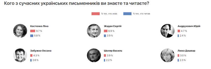На втором месте - Сергей Жадан, на третьем и четвертом - Юрий Андрухович и Оксана Забужко, а на пятом - Василий Шкляр