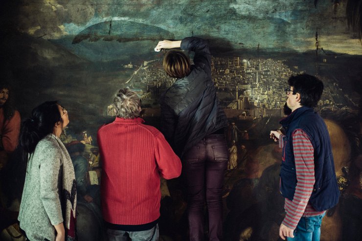 На огромном полотне масляными красками изображен маркиз в роскошных одеждах, со своей свитой въезжающий в Иерусалим.