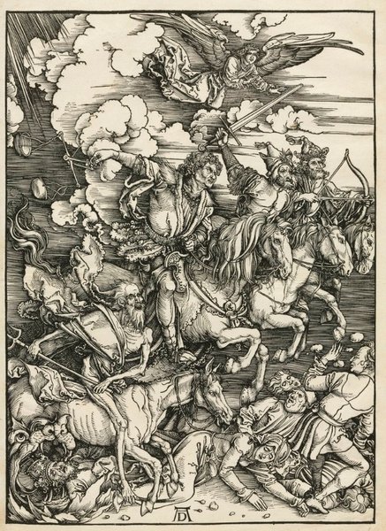 Серию гравюр "Апокалипсис" Дюрер создал после путешествия в Италию. Серия из пятнадцати гравюр, иллюстрирующая Откровение Иоанна Богослова, была впервые опубликована в 1498 году в Нюрнберге на латыни и немецком языке. Популярность гравюр серии была связана с широко распространенным в это время ожиданием конца света в 1500 году.