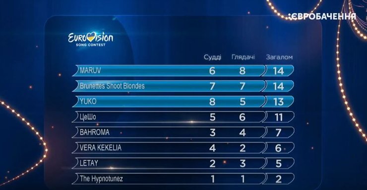 По результатам суммирования оценок зрителей и профессионального жюри были определены три участника финала нацотбора. Ими стали MARUV, Brunettes Shoot Blondes и YUKO.