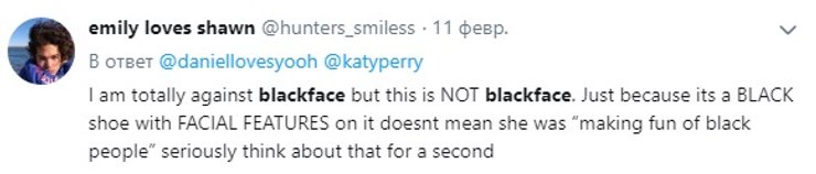 Перевод: "Я совершенно точно против "блэкфейс", но это не "блэкфейс"! Просто потому что это черные туфли с чертами лица, это еще не значит, что она "издевается над черными людьми", подумайте над этим хоть секунду".