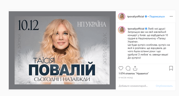 Отметим, что в последний раз украинская певица выступала в Киеве еще в 2014 году. После аннексии Крыма и последующих событий Повалий уехала в РФ, где часто давала концерты.