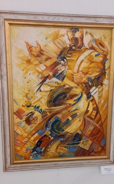 Прямо на входе картина Шевчука "Сеятель подсолнечника" – это некий символический или даже мифологический воин Украины, у которого бронежилет, сокол на руке, а за спиной – "Джавелин" — американский переносной противотанковый ракетный комплекс. Но при этом он занят вполне мирным делом – сеет космические подсолнухи. Картина подчеркивает, что ВСУ выполняет свой долг по защите Родины, но ради мира.