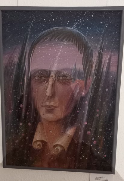 А другая работа, напротив, подчеркивает масштаб его фигуры и взглядов. Это портрет Сковороды "Поймать неуловимое" кисти Олега Шупляка, где полупрозрачную голову философа "проницает" космос. Вероятно, художник хотел подчеркнуть этой работой суть философской системы Сковороды: макрокосм (вселенная) – человек (микрокосм) – символический мир Библии.