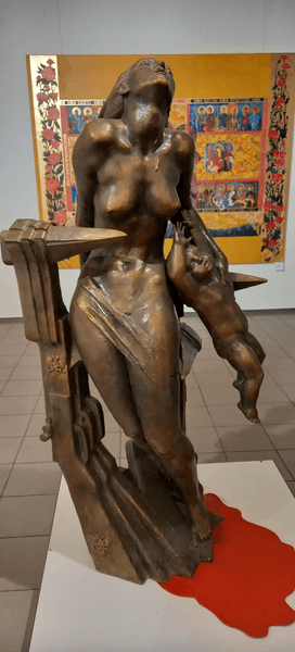 Большой интерес у публики вызывал проект памятника под названием "Рашисткий геноцид Украины. Мариуполь" скульптора Анатолия Куща – автора скульптур на нашем Майдане Незалежности. Мне, честно говоря, "Геноцид" показался интереснее Майдана – это красивая женщина с малышом, которую окружили российские автоматы с двуглавыми орлами и штык-ножами, а внизу растекается лужа крови.