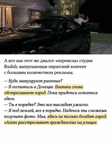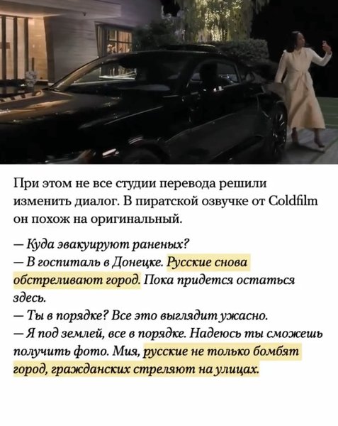 Meduza в качестве примера приводит фрагмент двух пиратских переводов. В одном вместо российских солдат указывают, что бомбят "русские" и они расстреливают людей. Впрочем, не указано, что русские — это солдаты ВС РФ.