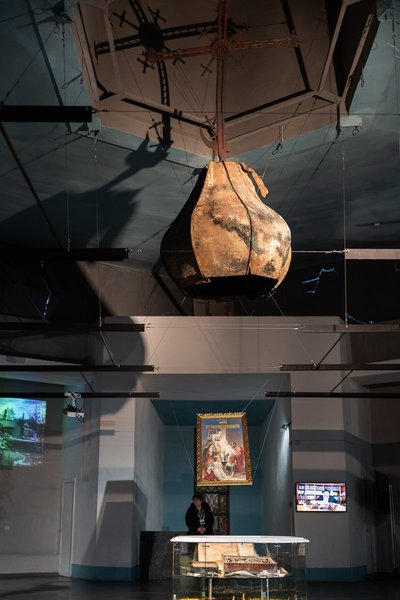 Прямо посреди центра зала на тросах висит поврежденная огромная икона "Снятие с креста" из разрушенного оккупантами Храма Святого Димитрия Ростовского ( пгт Макаров).