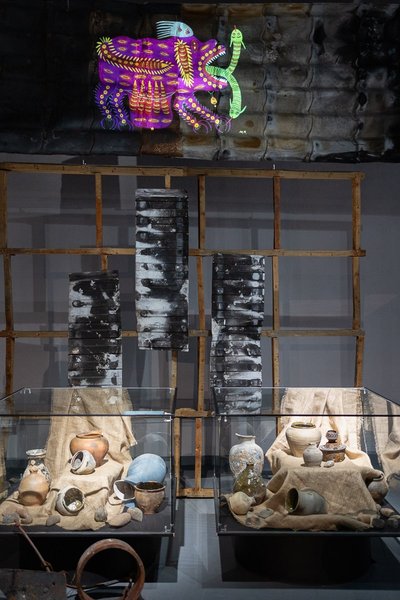 Недалеко от него изуродованный каркас, на котором висели картины известной художницы Марии Примаченко из сожженного Иванковского историко-краеведческого музея. Мы наблюдаем проецируемое изображение картины Марии Примаченко "Атомная война — будь проклятая она" (1978): чудовище, из пасти которого вырывается язык в виде двух змей. "Сегодня эта работа как никогда актуальна — в свете российских ядерных угроз", — замечает Савчук.