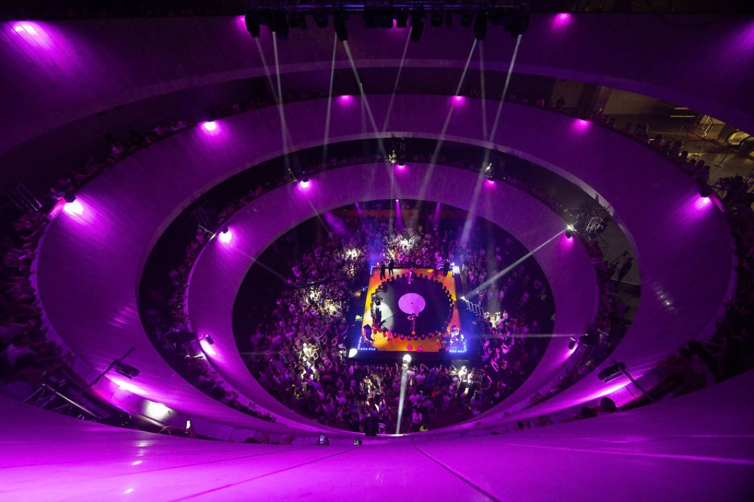Именно здесь прошел знаковый концерт, во время которого артист в буквальном смысле парил в воздухе в свете лазерного шоу над сценой в форме виниловой пластинки.