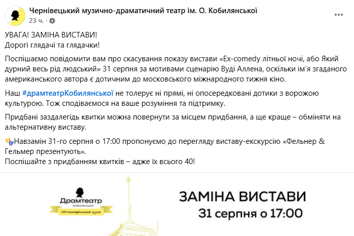 В Черновцах отменили показ спектакля "Ex-comedy летней ночью, или Как глуп весь род человеческий" 31 августа по мотивам сценария Вуди Аллена, объяснив это тем, что имя упомянутого американского автора причастно к московской международной неделе кино.