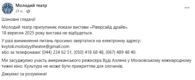 "Наш #драмтеатр Кобылянской не терпит ни прямые, ни опосредованные прикосновения с враждебной культурой. Так что надеемся на ваше понимание и поддержку", – говорится в сообщении.