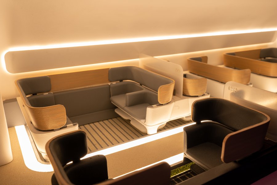 Судя по опубликованным фотографиям, экспозиция одной из пассажирской капсула обустроена подобно кинотеатру: один ряд мягких кресел внутри имитации корпуса без крыши расположен прямо напротив большого экрана. Еще один контейнер, судя по сидениям — пассажирский, представлена в миниатюре. Она демонстрирует дизайн, выбранный Virgin Hyperloop, а также общее расположение элементов. В частности, можно выделить длинные светильники, вмонтированные в пол и стены. Грузовая капсула синего цвета установлена снаружи.