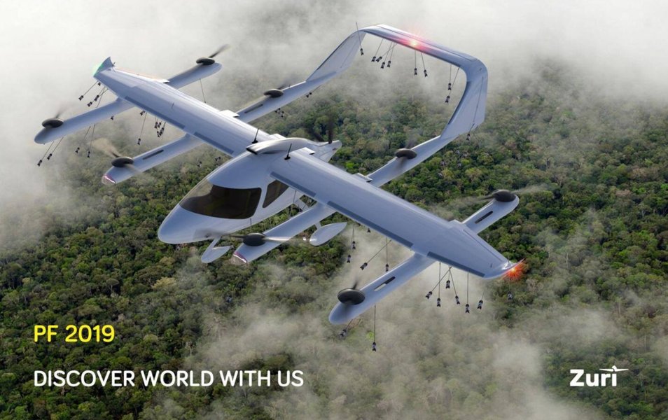 Zuri подготовила демонстрационный самолет, рассчитанный на четырех человек. Он получил классический круизный дизайн, большие крылья с четырьмя длинными силовыми установками и восемью пропеллерами для движения вверх и вниз. Две средние опоры переходят в огромное заднее антикрыло (которого нет у демонстрационной модели), а позади кабины расположен движущий винт.