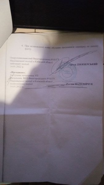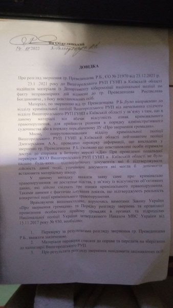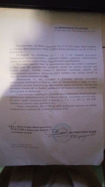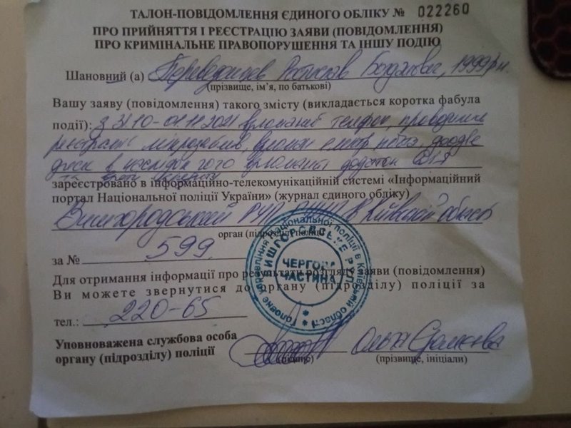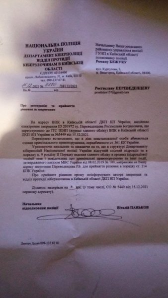 Три МФО, — MyCredit, CreditBox, "Швидко Гроші", — посоветовали ему обратиться в киберполицию, чтобы данные внесли в Единый реестр досудебных решений, и сотрудники компаний смогли проверить ситуацию со своей стороны. Ростислав Переведенцев сообщил, что 14 декабря 2021 года обратился в киберполицию с заявлением о "взломе приложения Дія". Киберпол за неимением следственного отдела перенаправил документы в Вышгородское районное управление полиции, а там отказались регистрировать данные в ЕРДР ввиду отсутствия признаков преступления (см. документы ниже). По словам Ростислава, правоохранители мотивировали отказ тем, что он не понес материального ущерба. Сейчас парень отстаивает свою позицию при помощи адвоката.