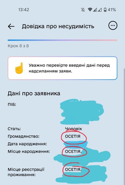 В заявке на получение справки о несудимости в приложении "Дія" можно указать Осетию в качестве страны, где человек родился.