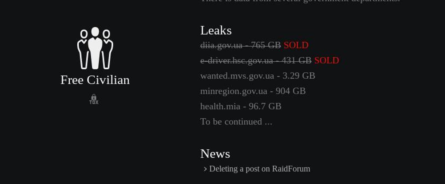 Примечательно, что файлы разместил пользователь с ником FreeCivilian, который ранее опубликовал фрагменты персональных данных украинцев, якобы украденные из государственного портала "Дія" и "Кабинета водителя". Сейчас эта база объемом 765 ГБ отмечена, как проданная. Тем не менее, новые "дампы" опубликованы полностью.