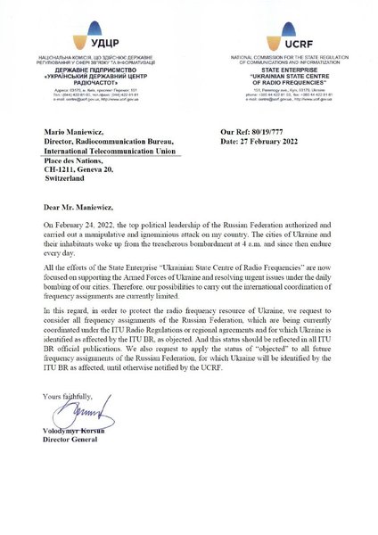 В связи с вторжением российских войск на территорию Украины и в целях защиты радиочастотного ресурса страны глава регулятора Владимир Корсун направил официальное письмо на имя Марио Маневича, директора БР МСЭ, с просьбой считать все частотные присвоения РФ, которые находятся на координации согласно Регламенту радиосвязи МСЭ или региональных соглашений, в соответствии с которыми Украина определена БР МСЭ как "задетая", — нескоординированными.