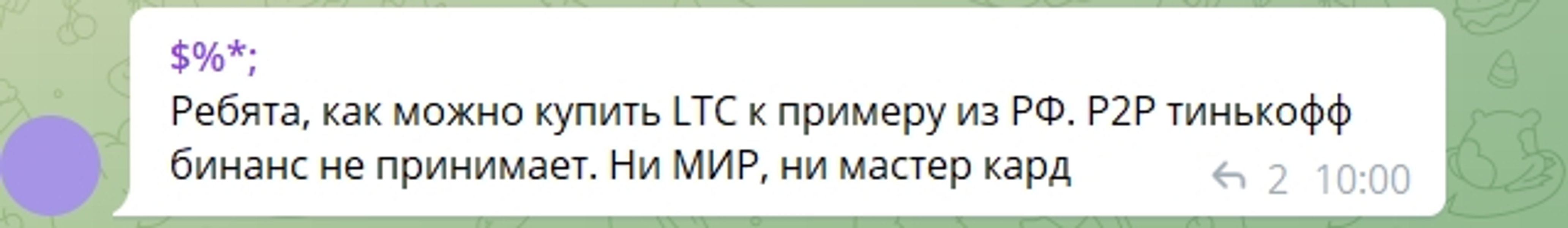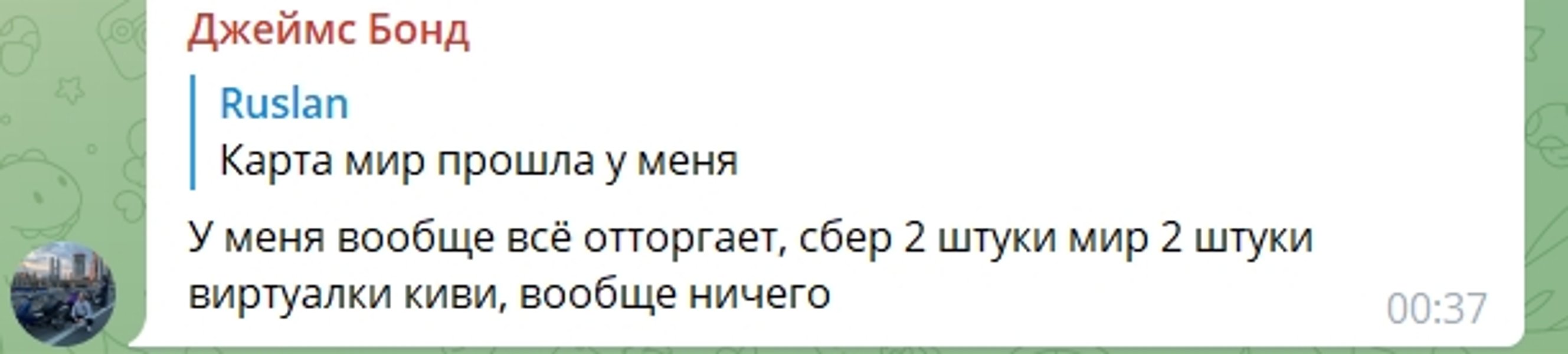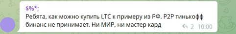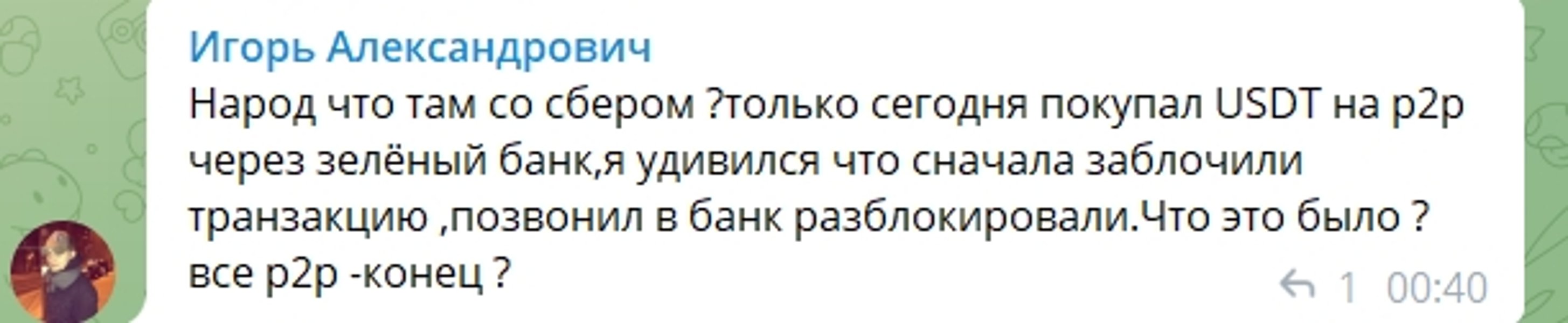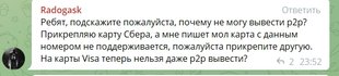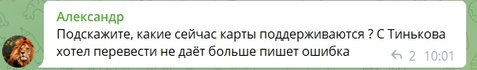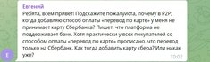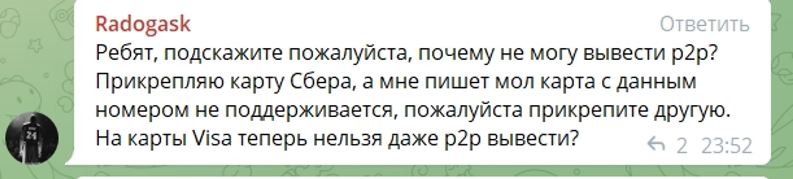 В Телеграм-канале Binance Russian многие пользователи пожаловались на проблемы с Р2Р-переводами, в частности на карты "Сбербанка". Некоторые также пишут, что не смогли совершить платежи через карты через платежную систему "Мир" и карты банка "Тинькофф".