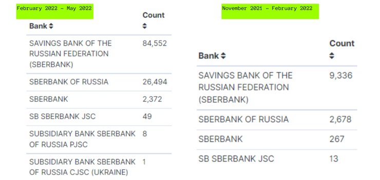 Согласно недавнему исследованию, на "Сбербанк" приходится 18% всех "утечек" данных карт в мире с февраля по апрель 2022 года. Для сравнения: за три месяца до начала полномасштабной войны в Украине хакеры обнародовали в даркнете данные около 12,3 тысячи карточек, или 4% от количества по всему миру.
