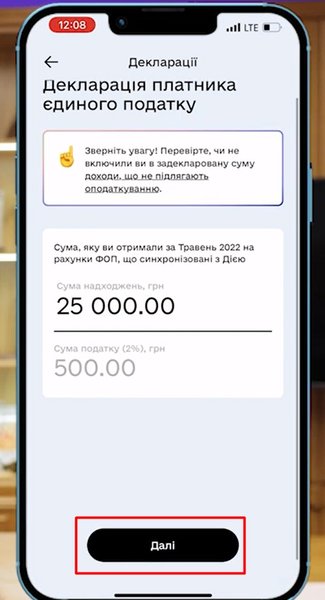 - Ввести сумму поступлений на счета ФЛП, синхронизированные с "Дією" — система автоматически рассчитает сумму налога;