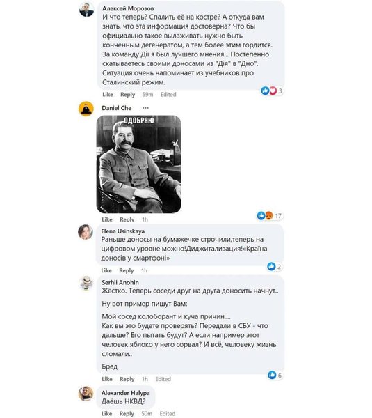 Некоторые пользователи усмотрели в работе чат-бота инструментом борьбы с личными врагами, вспомнили времена советского диктатора Иосифа Сталина и назвали такую политику превращением Украины в "страну доносов".
