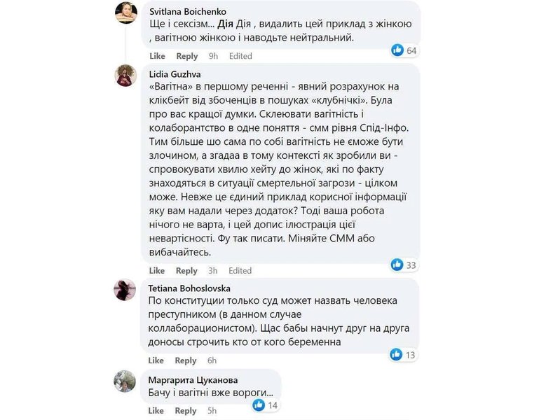 "Еще и сексизм. Дія, удалите этот пример с беременной женщиной и приведите нейтральный", – говорится в одном из комментариев.